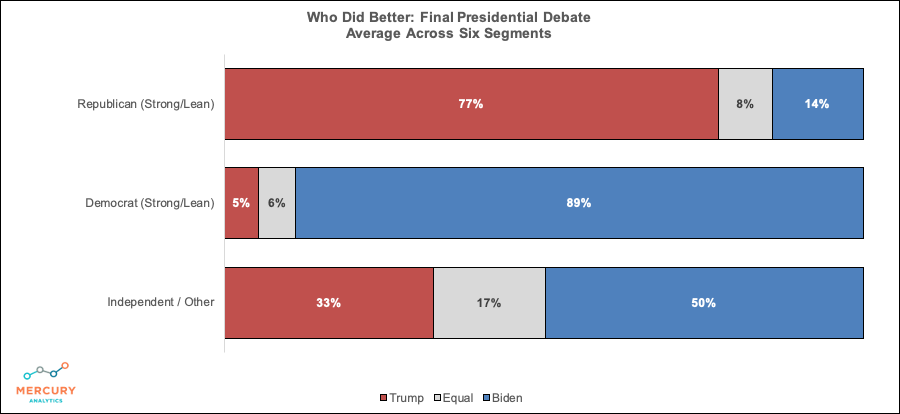 Mercury Analytics conducted an overnight survey including dial-tests of the final presidential debate between President Donald Trump and Democratic Presidential Candidate Joe Biden, which took place on October 22nd, 2020 at Belmont University in Nashville, TN.