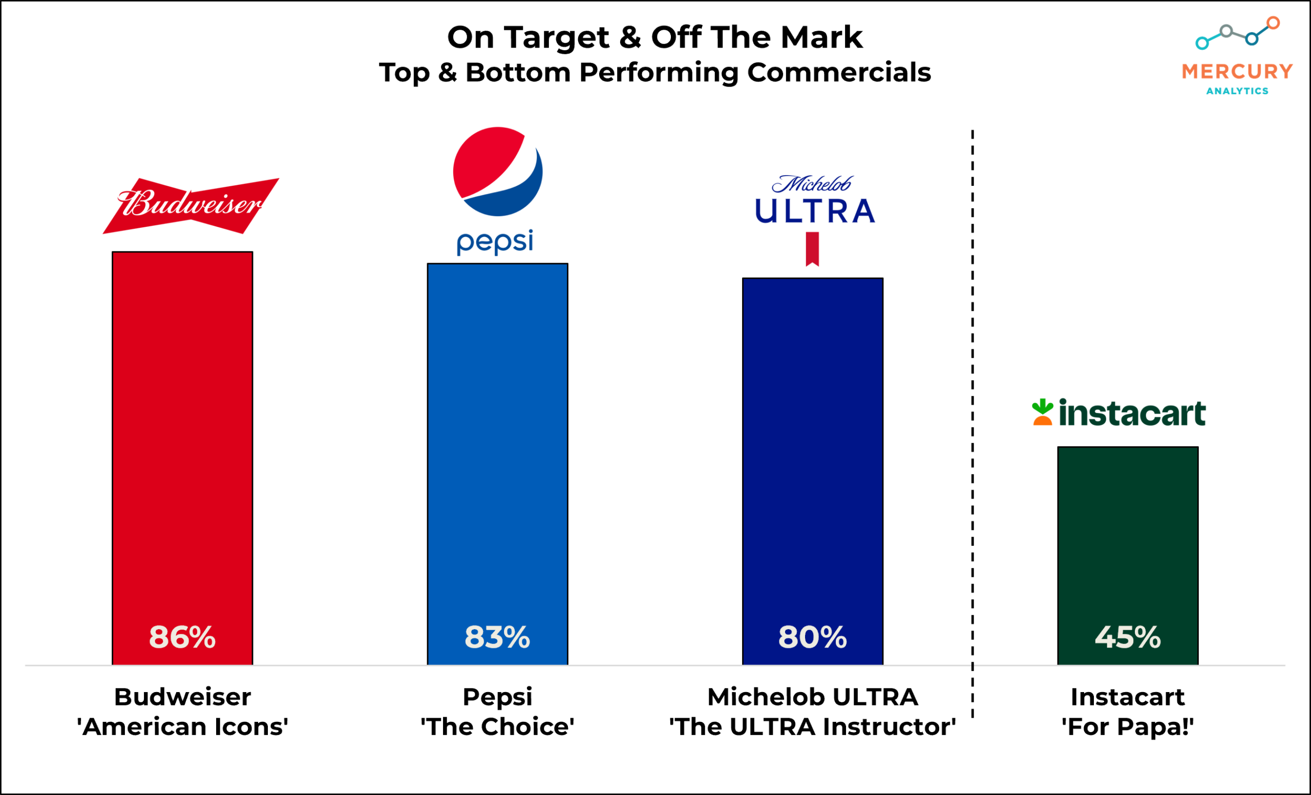 Among the thirteen ads tested, Budweiser, Pepsi, and Michelob ULTRA deliver the highest-rated commercials. Budweiser sticks to its heartwarming approach to commercials while Pepsi and Michelob ULTRA lean into humor, creating ads that catch viewers’ attention, keep them engaged, and resonate strongly. On the other hand, Instacart also takes the humorous approach, but seems to overdo it, delivering an ad that ultimately falls flat and ranks last in our lineup.