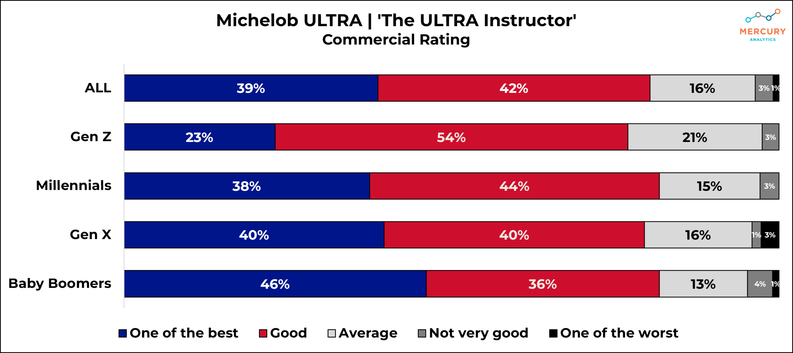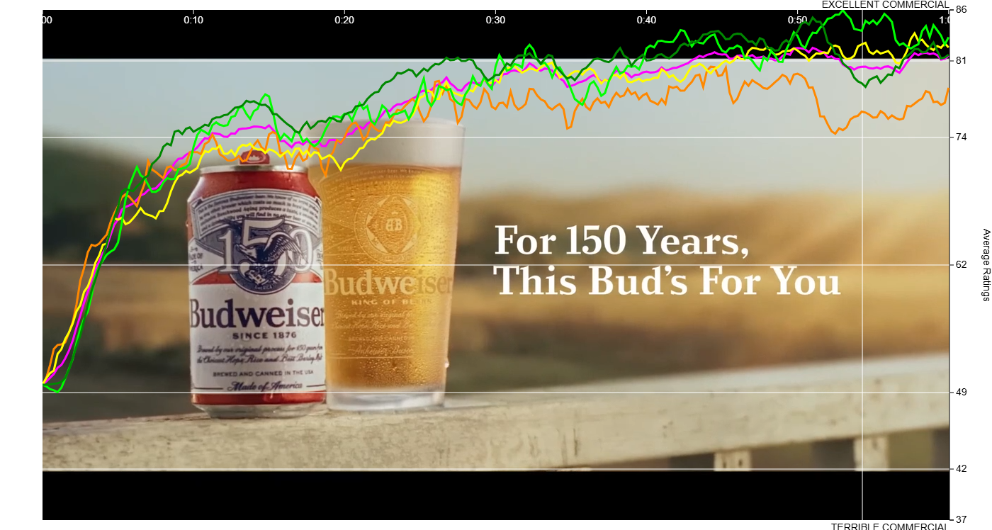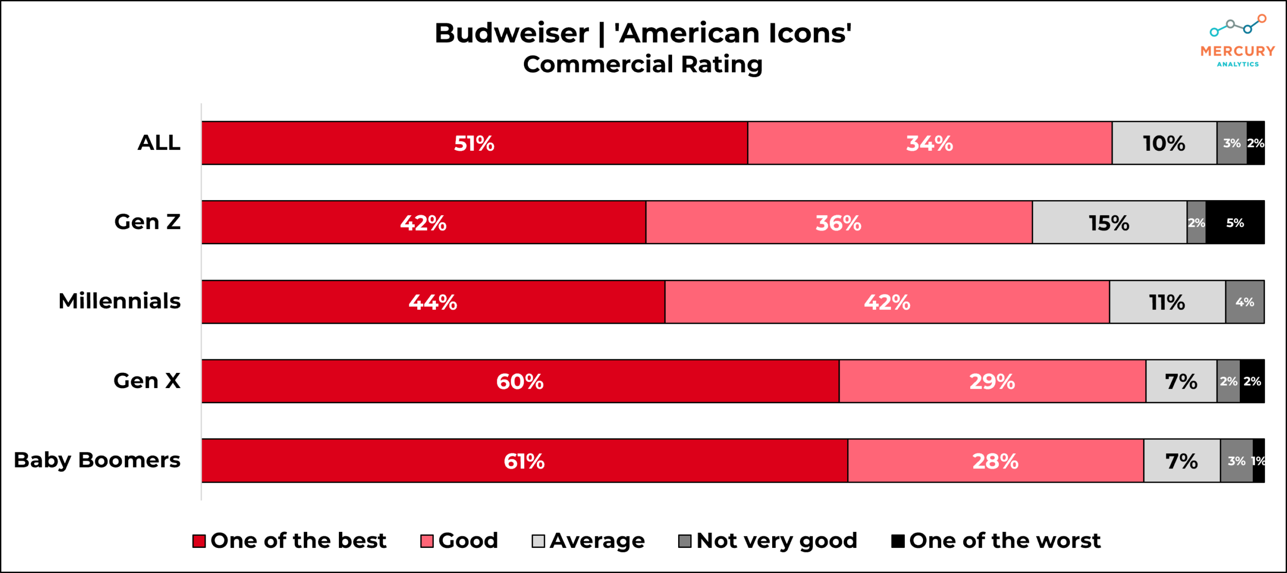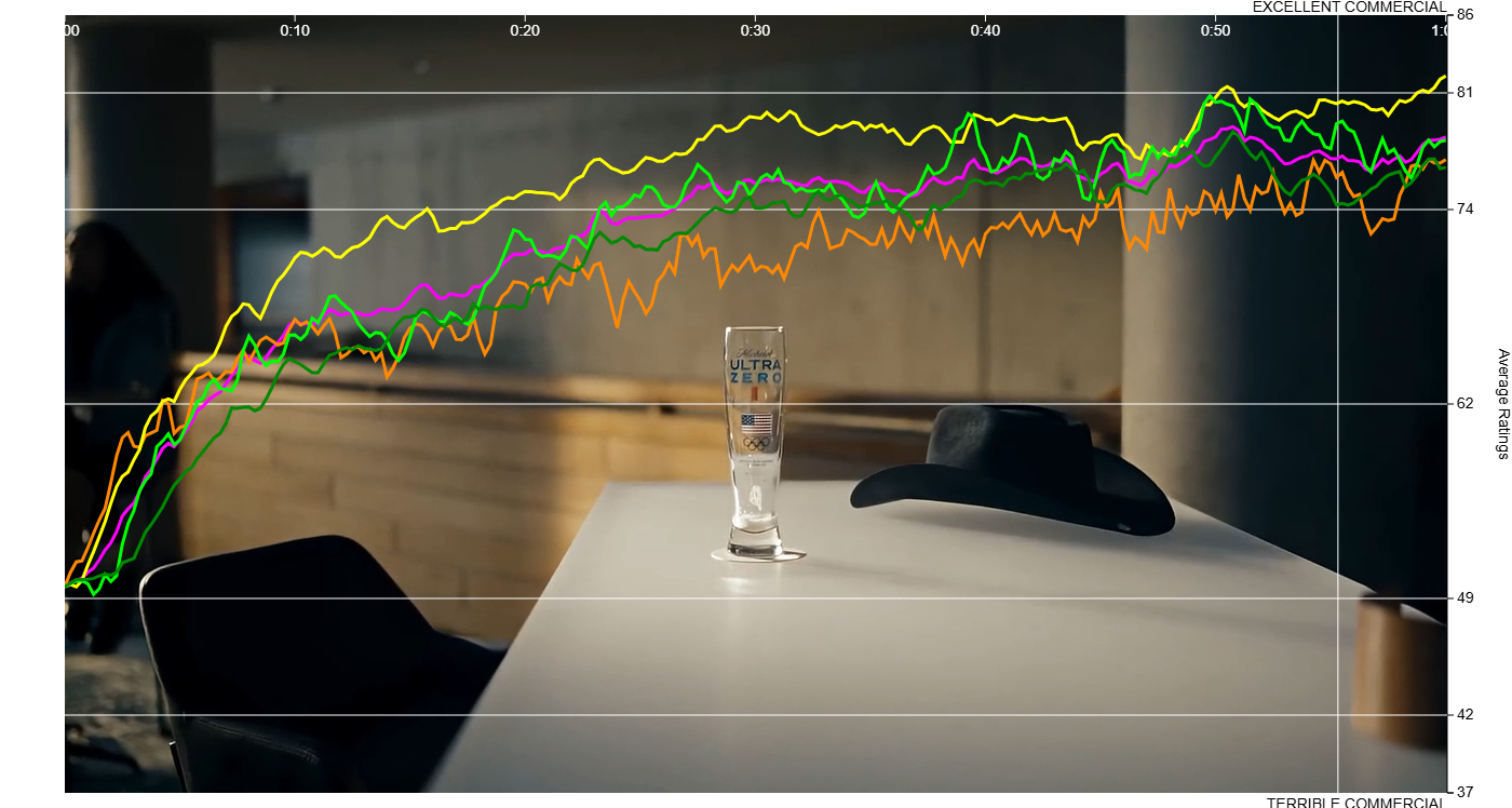 All four generations thoroughly enjoy the Budweiser ad, with ratings consistently increasing from start to finish. Interestingly, both Gen Z and Baby Boomers indicate a slight dip in ratings when Budweiser is being poured and “Made of America” appears on screen, but ratings recover before the end of the commercial.