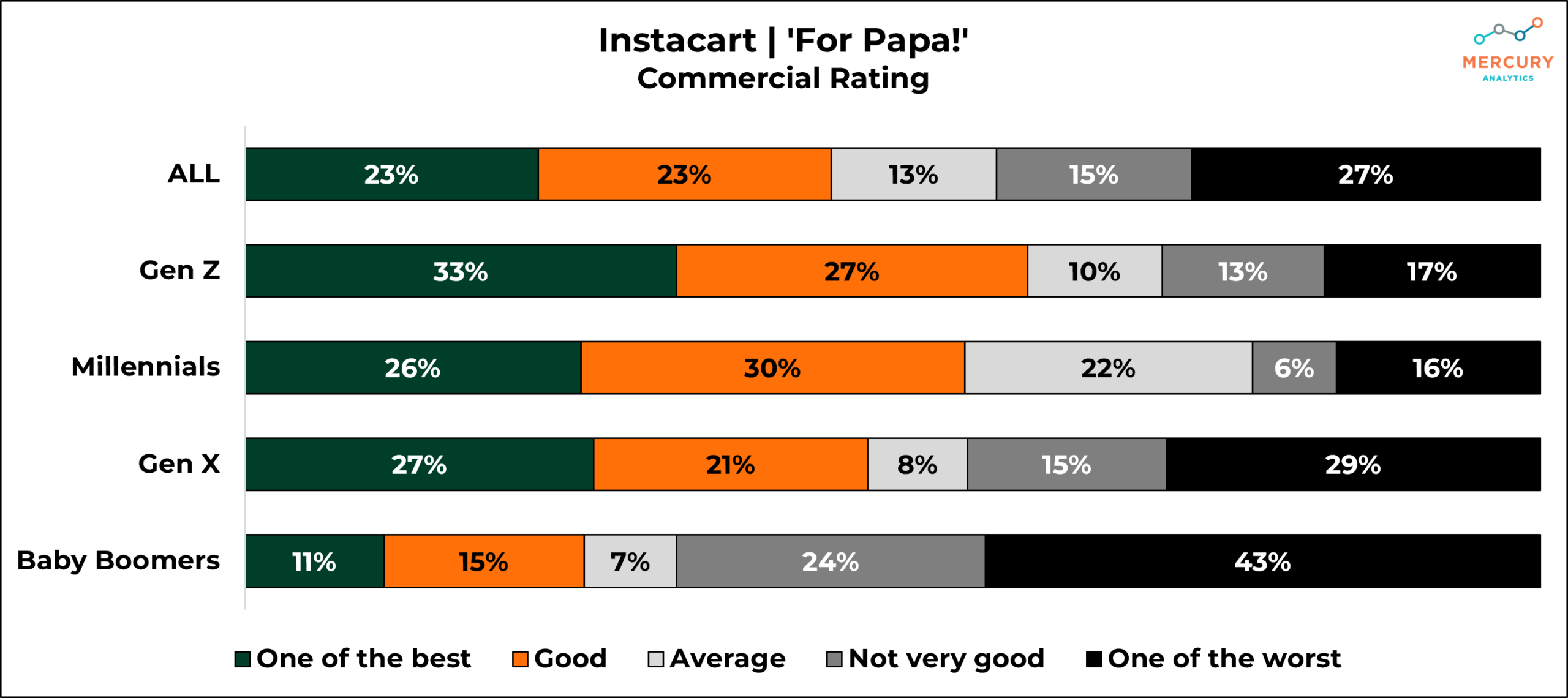 Comparatively, the Instacart ad reaches Millennials, followed by Gen Z, most successfully. Gen X shows isolated moments of appreciation, while Baby Boomers consistently lower their ratings as the commercial progresses.