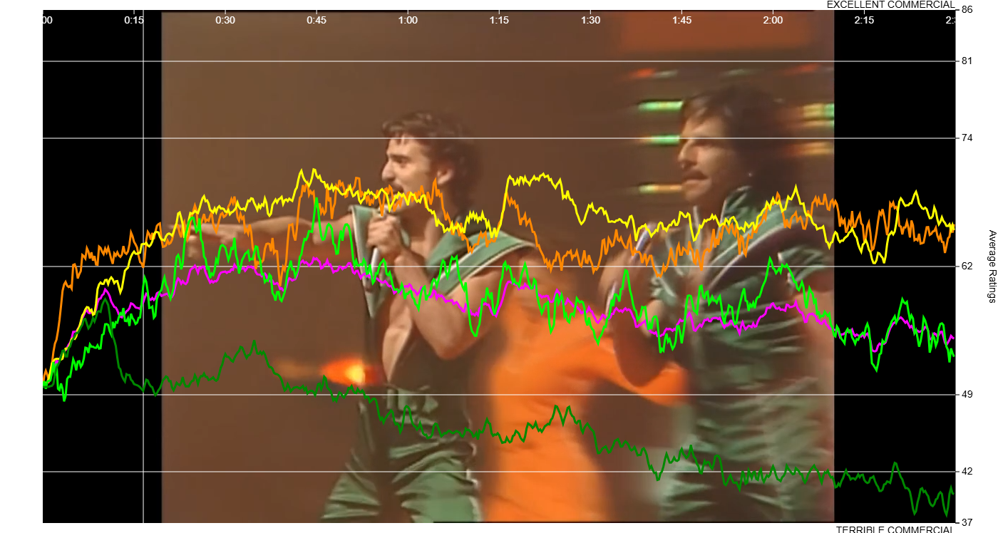 As participants watched each commercial, they moved a slider just below the video to the right the more strongly they thought the commercial they were watching was “excellent”, or to the left the more strongly they thought the commercial was “terrible”. They also had the option to push a button that would identify a “SPECIAL MOMENT”.